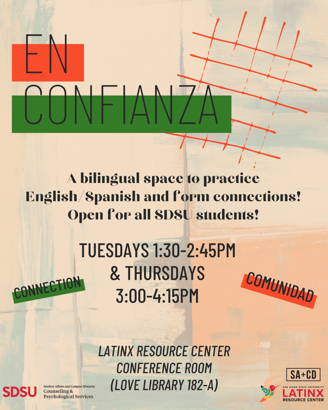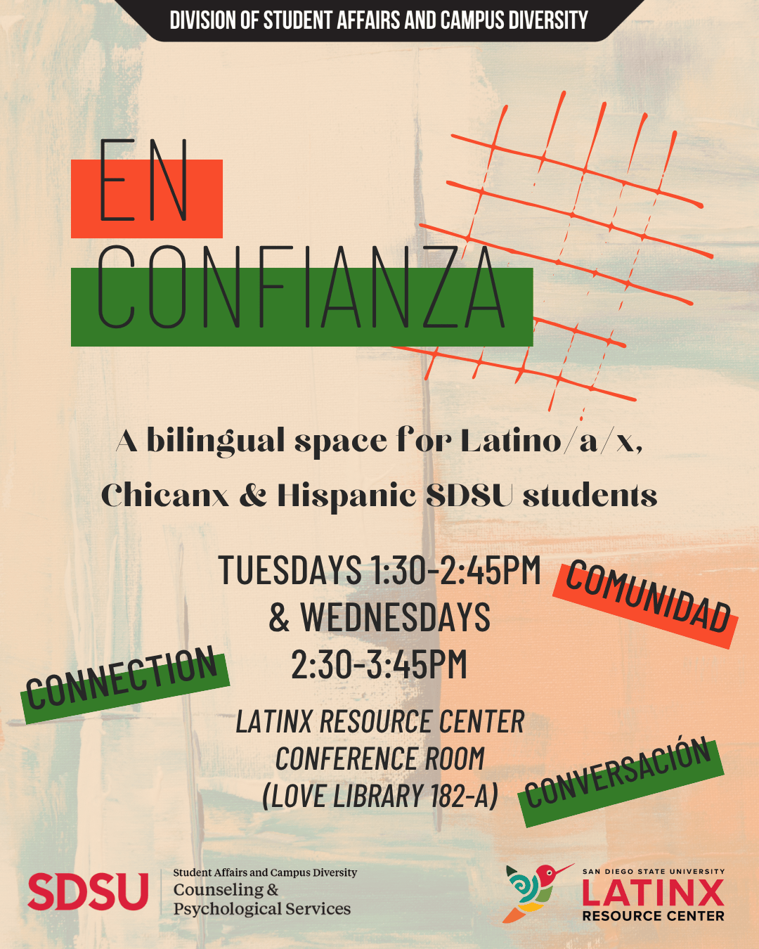 En Confianza @ SDSU is a group where you will find support and together we will learn how to face the challenges of culture shock, generational differences, and the challenge of belonging to two or more cultures. At En Confianza, we will learn how to be successful in our lives emotionally, academically and professionally. We welcome you to spend some time with us at the first group held in Spanish, Spanglish and English.