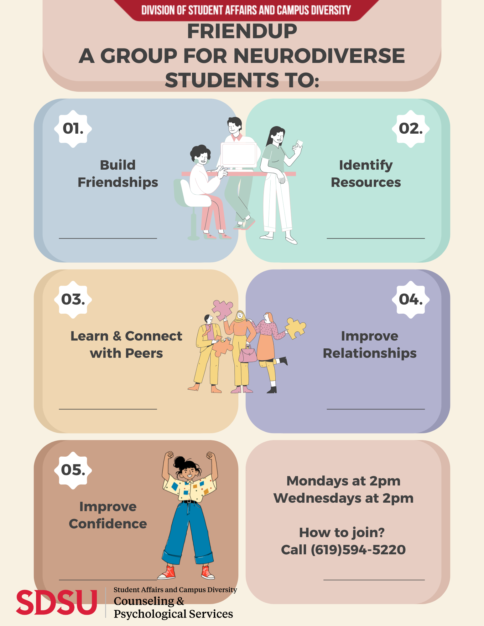 FriendUp is a group for neurodiverse students at SDSU who are interested in building friendships and improving confidence in social settings. This is a safe space to build community, obtain support with learning skills to improve relationships of all kinds, and address anxiety that can come up in social interactions. We look forward to seeing you there!