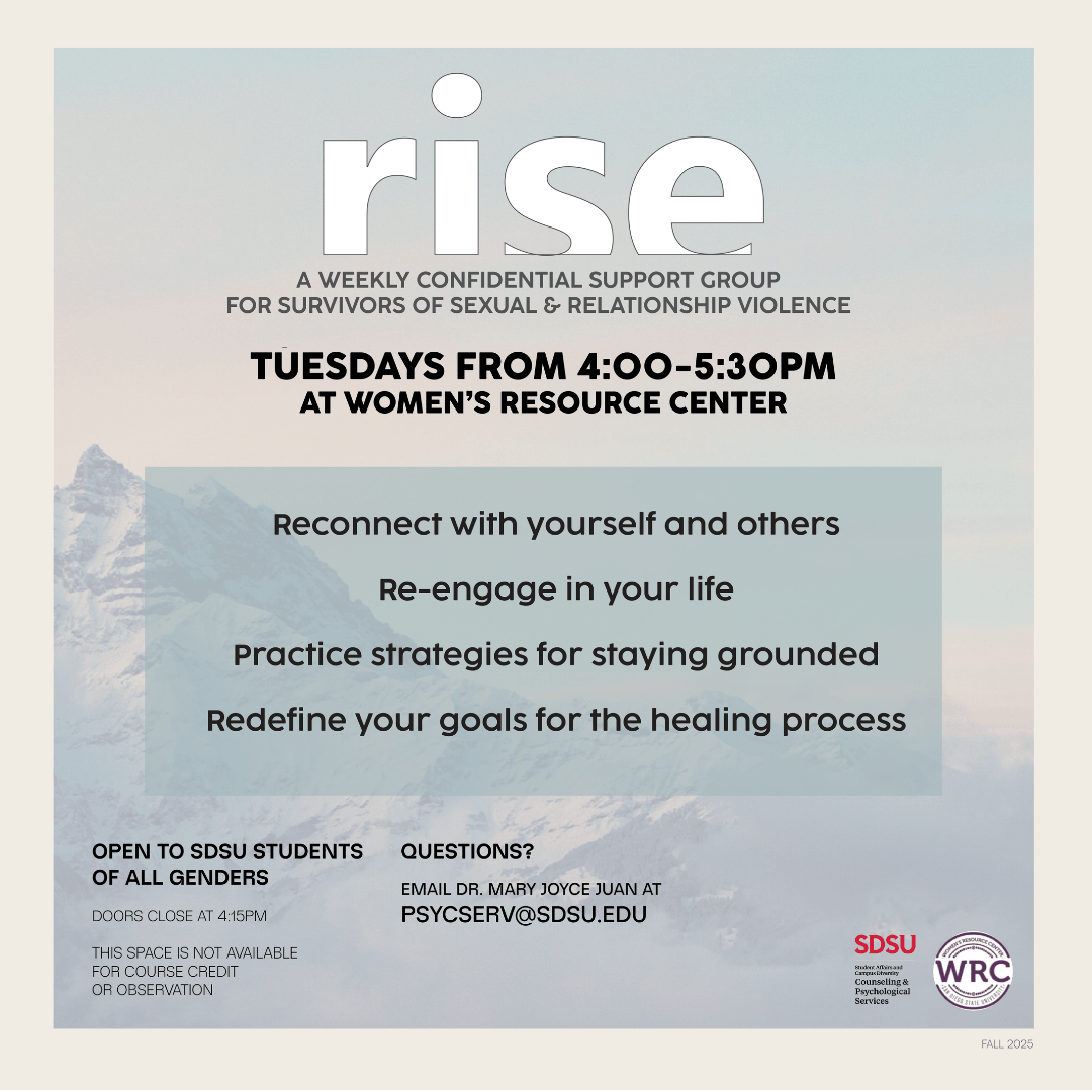 Rise is a confidential supportive space for survivors of sexual assault and relationship violence. The group currently meets at the Women's Resource Center (WRC) to honor the legacy of WRC students advocating for this support space. However, this group is open to SDSU students of all genders.